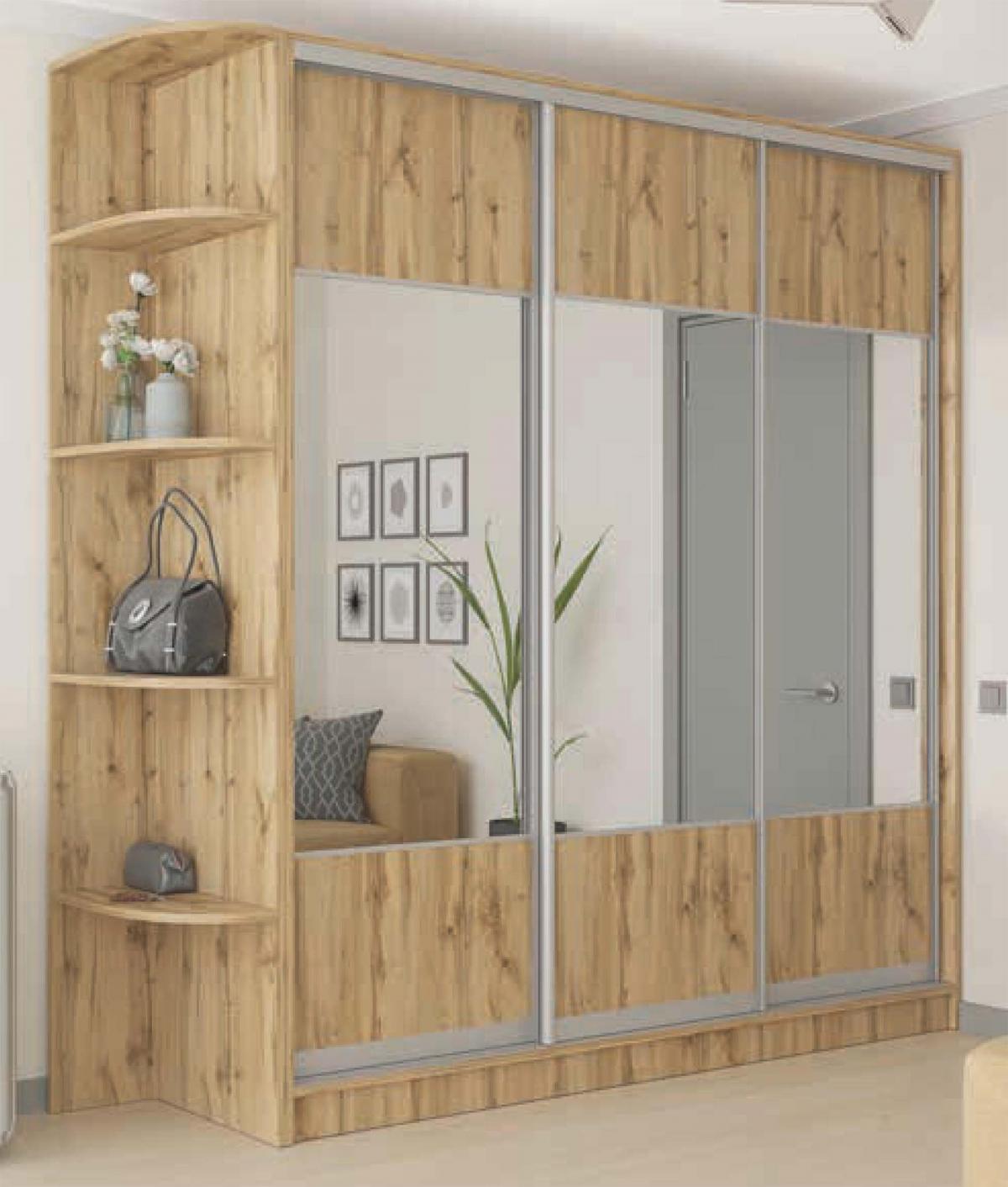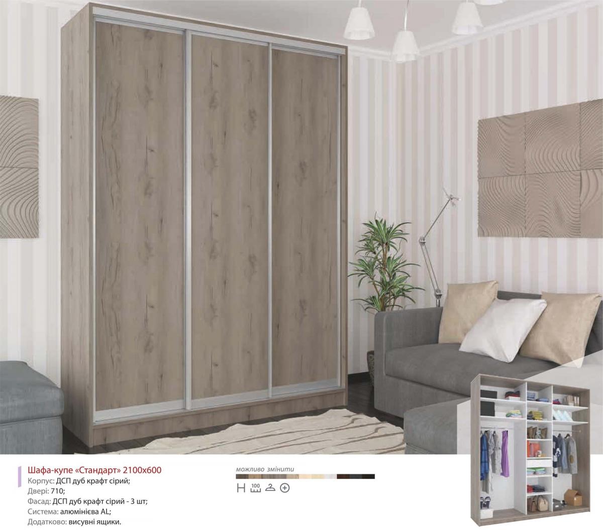 Базовая цена включает в себя корпус из ДСП 16 мм, комплектацію дверей з профілю AL (колір срібло), наповнення дверей: ЛДСП 16 мм або комбі ДСП/ДСП. Шкаф-купе укомплектован эмалированной штангою. Ящики, с телескопическими направляющими, размещены в отделениях между полками шкафа. Угол, карниз и ящик не входит в комплект.