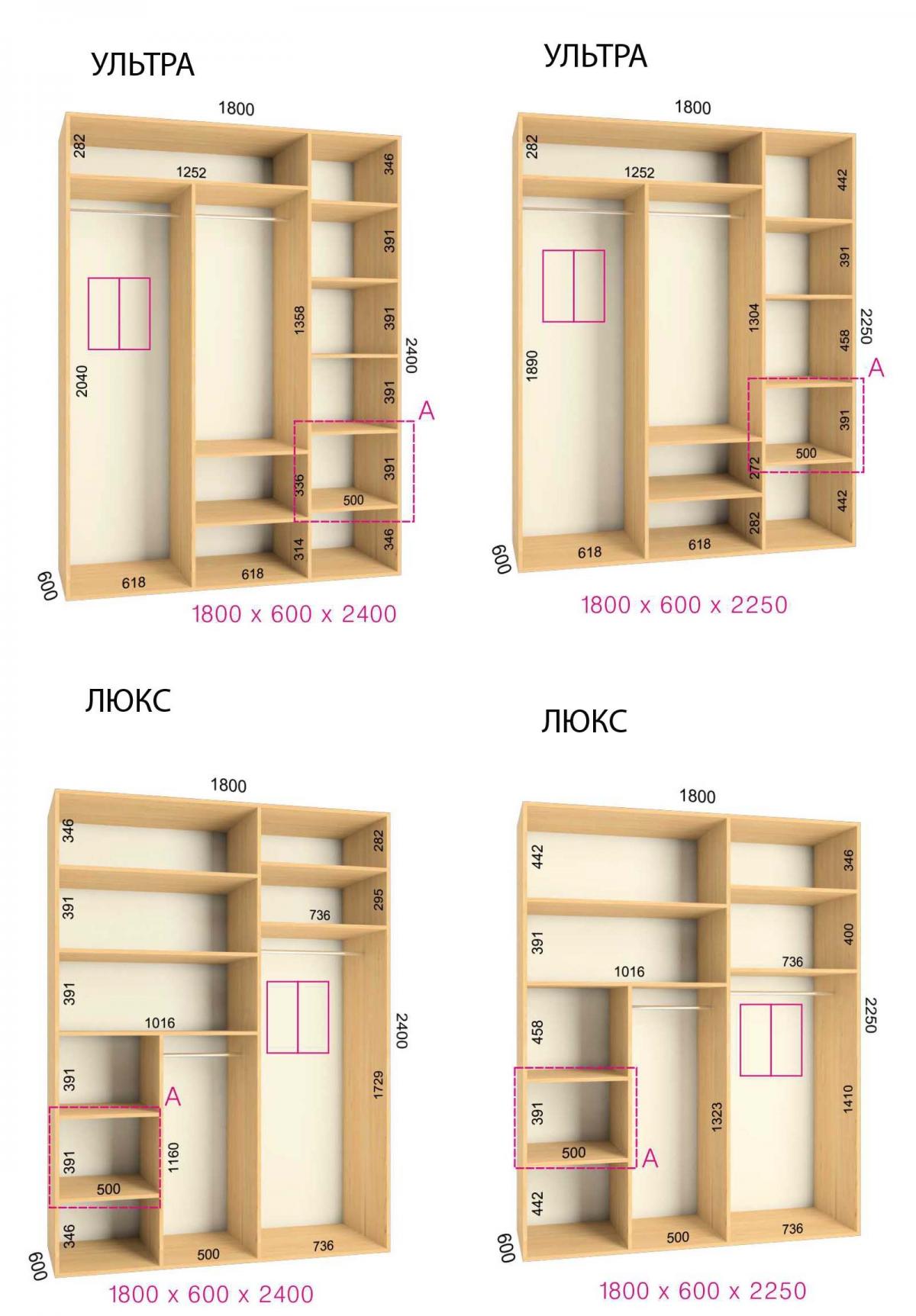 *Базовая цена включает в себя корпус Люкс из ЛДСП Krono 16мм 1,8*2,25*0,6м ЛЮКС, комплектацию дверей из алюминиевого профиля цвет серебро, наполнение дверей: ЛДСП 16 мм. Угловое окончание и карниз не входит в стоимость.